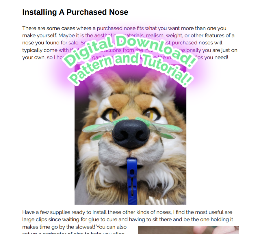 An in-depth tutorial on all kinds of fursuit noses. This guide includes 26 pages of detailed information on sewing noses, sculpting them, covering them in fabric, and also a few tips for installing purchased noses by other artists. I have spent many years writing and developing this collection of advice on noses over the years and I am excited to share step by step detail on how to create and install noses of all kinds. Tutorial text is written in English.
