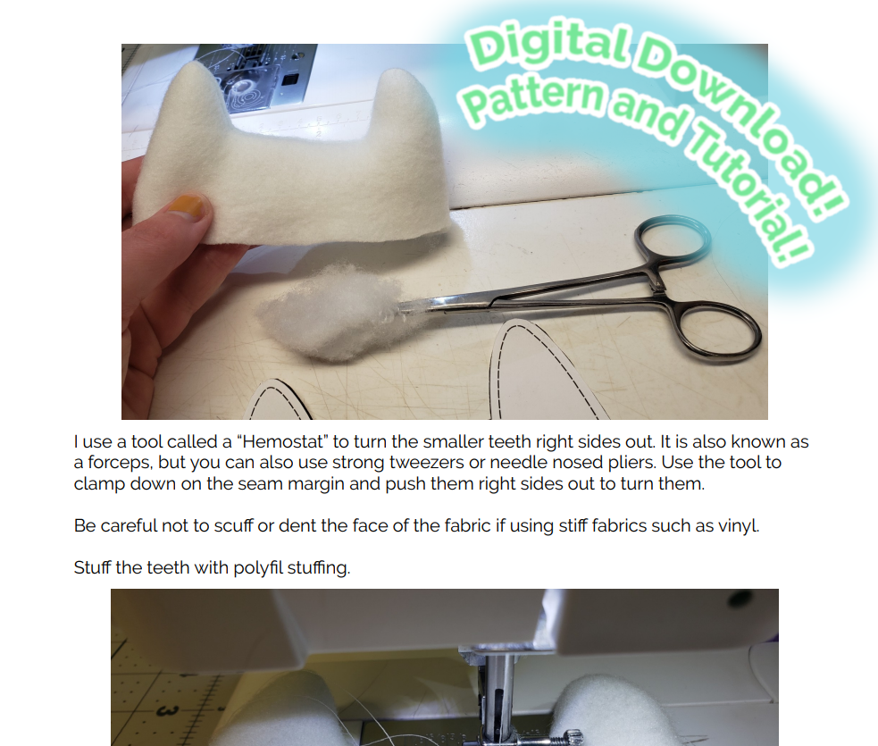 19 pages of helpful, detailed, step-by-step text with diagrams and photos. The printable sewing pattern, features 3 shapes of fangs and 2 sets of lower incisors with fangs as well as details on how to draft your very own tooth patterns.