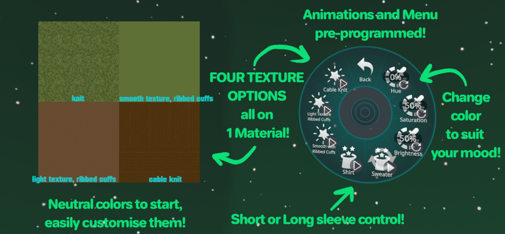 You are welcome and encouraged to further customise the base colors or textures! If you decide to edit the textures you have 4 options to edit. The top left, top right, bottom left and bottom right are each a different color or texture the shirt can be. The shirt texture is adjusted by telling the shader to reference those 4 positions so you can make a different shirt texture or color for each of the 4 areas.