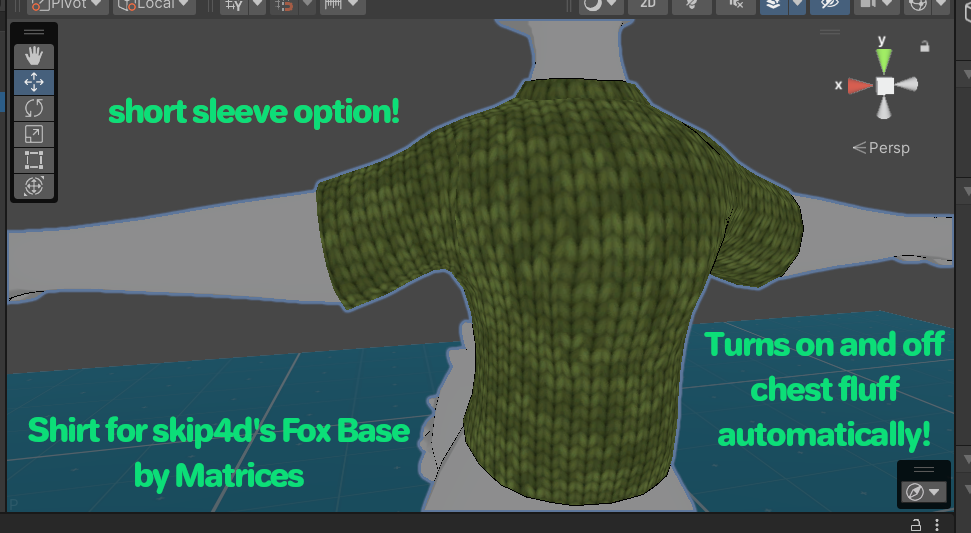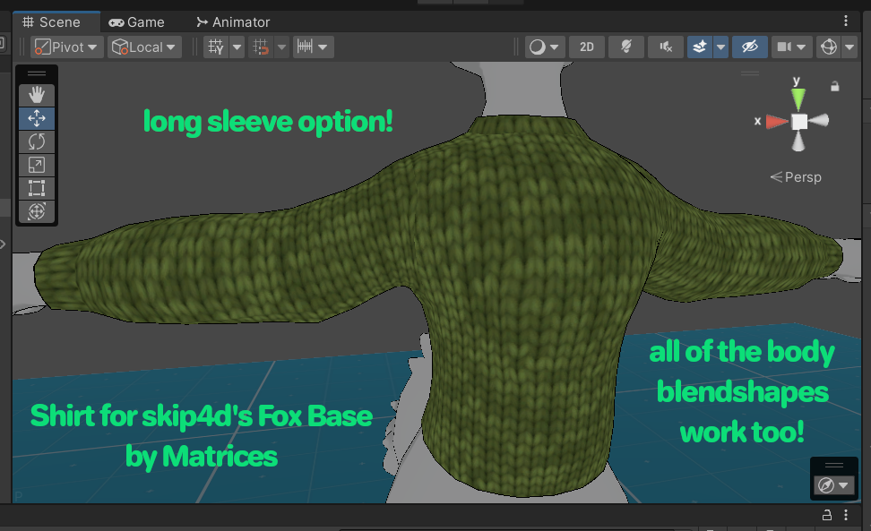 - FoxShirtbyMatrices.unitypackage - Has all of the shirt-related scene, prefabs, textures, other files, animations, .fbx and a copy of the .blend for manual installation.